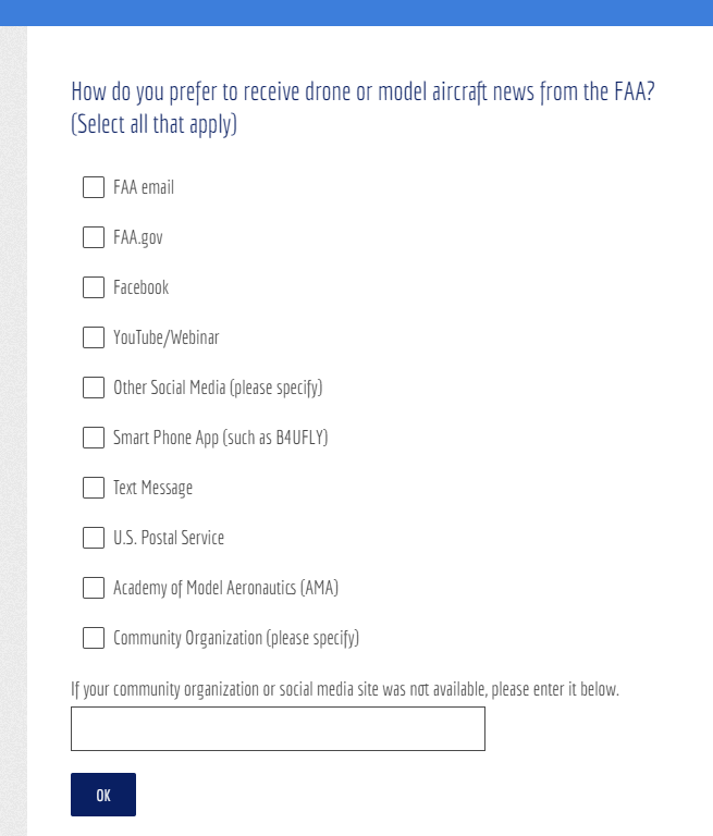 Over the past month, many recreational fliers have received an FAA survey requesting feedback on items such as communication preferences and flight habits pertaining to Unmanned Aircraft Systems (UAS). AMA can confirm that this is a legitimate email survey, which the FAA’s website covers here.