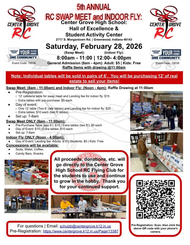 I am a teacher sponsor for the Center Grove High School RC Flying Club. We host Indoor flying events throughout the winter months as a fundraiser for the students. I’d love to share a little more information about this and also invite you to Greenwood, Indiana, for these events. Our next large event is a full swap meet in the worming, a raffle at 11 a.m., then Indoor flying from 12-4 p.m. on February 28, 2026! We’ll also have other Indoor flying events in April and May. Please let me know if you have any questions about this!
